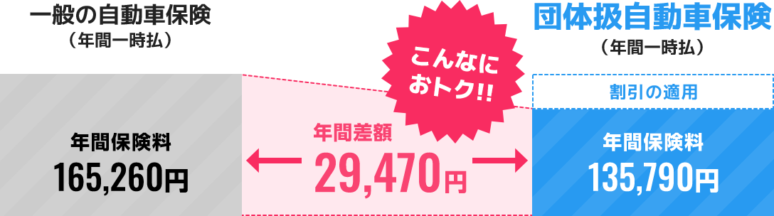 大口団体割引13.5%と、年間の保険料を一括で払うと、団体扱一括払割引としてさらに5%の割引が加わり、一般の自動車保険の契約にくらべると約17.8%※(一時払の場合)割安です。