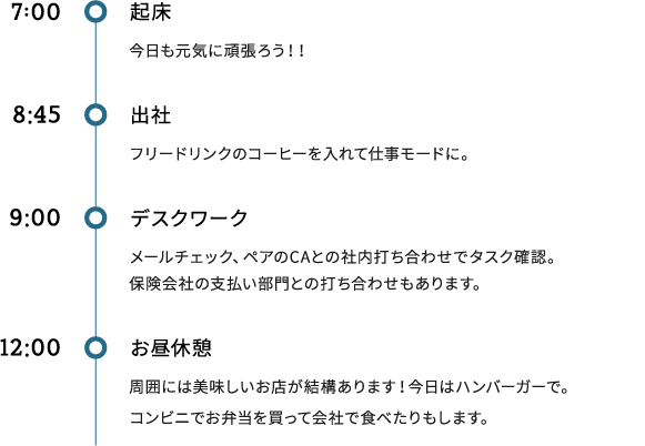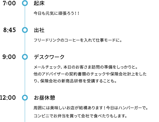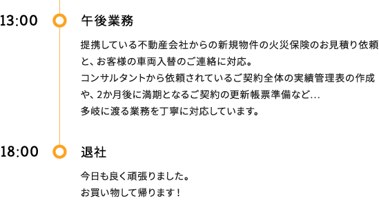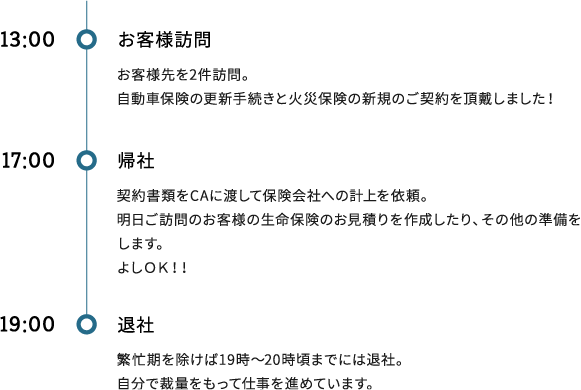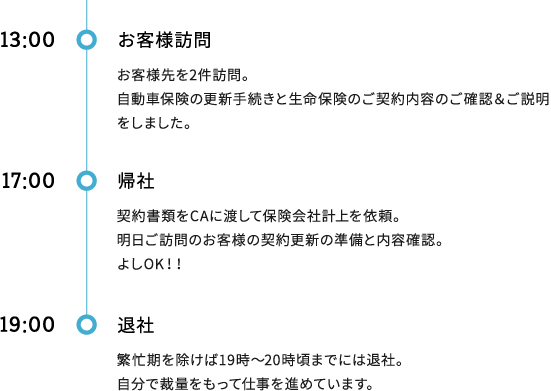 お客様の状況を詳細に把握し、必要な保険があればご提案もさせて頂きます。CAが担当する事務面の仕事も一部担います。